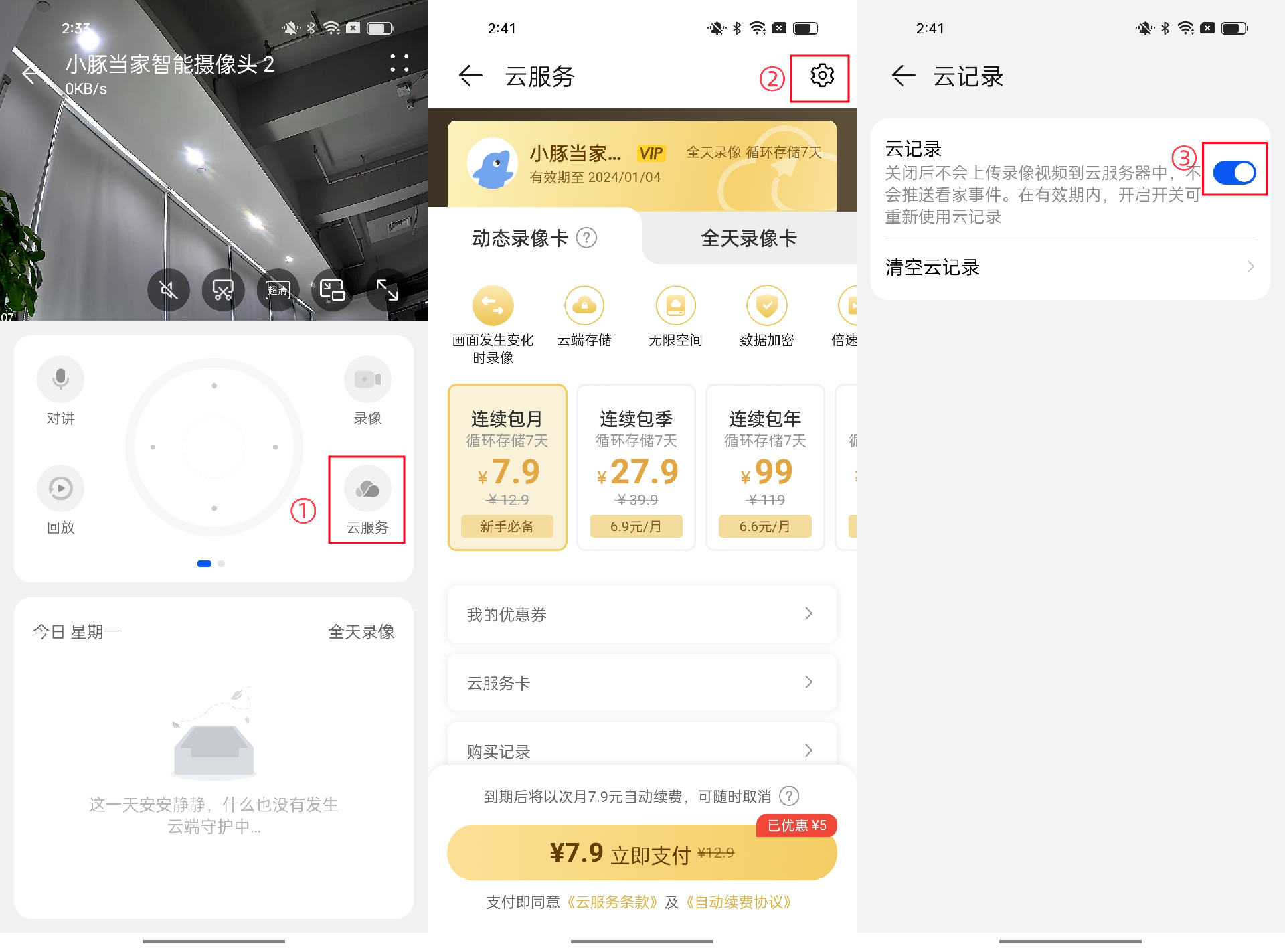 Wi-Fi摄像头:智慧生活App > 小豚当家摄像头 > 点击“∷”或“┆”进入“设置”界面 > 云服务。