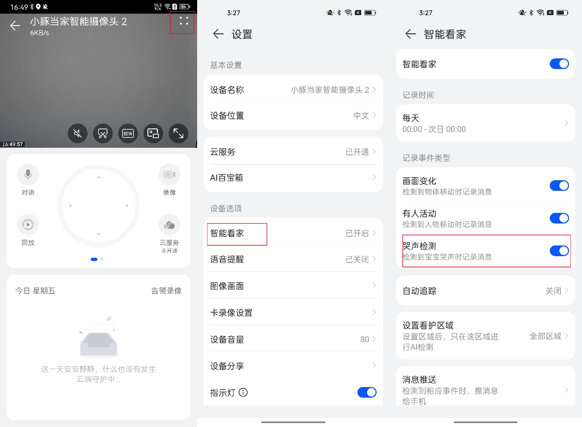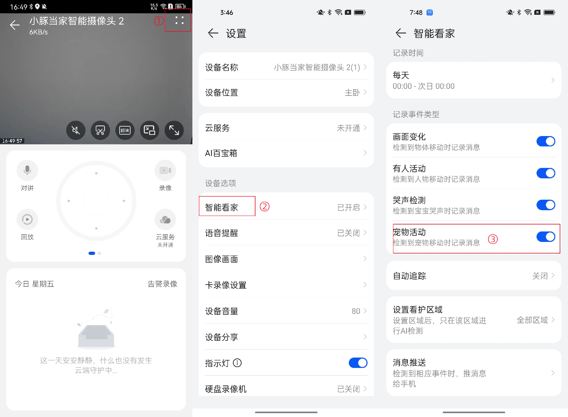 步骤三:进入智慧生活App>小豚当家智能摄像头2>点击“∷”进入“设置”界面>智能看家,按个人需要开启对应功能按钮画面变化: