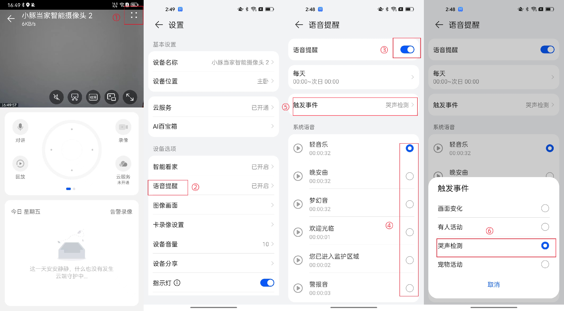 操作路径:智慧生活App > 进入监控页面 > 点击“∷”进入“设置”界面 >语音提醒/打开>调整时间与触发事件。