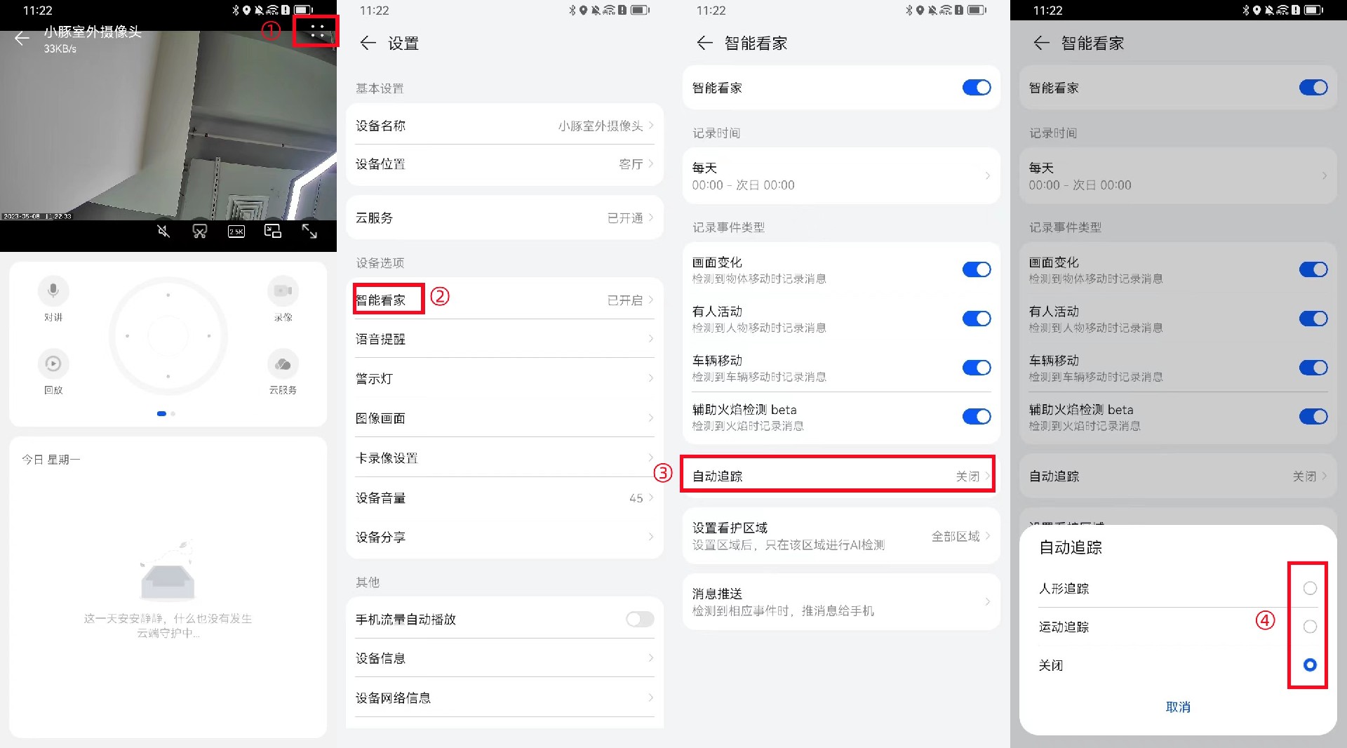 (1)确认“有人活动”等AI侦测功能是否开启,如否请开启。路径:进入华为智慧生活App> 小豚室外摄像头>点击右上角“∷”或“┆”进入“设置”界面>智能看家。