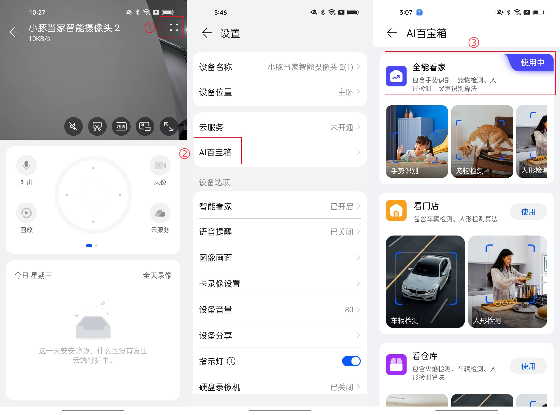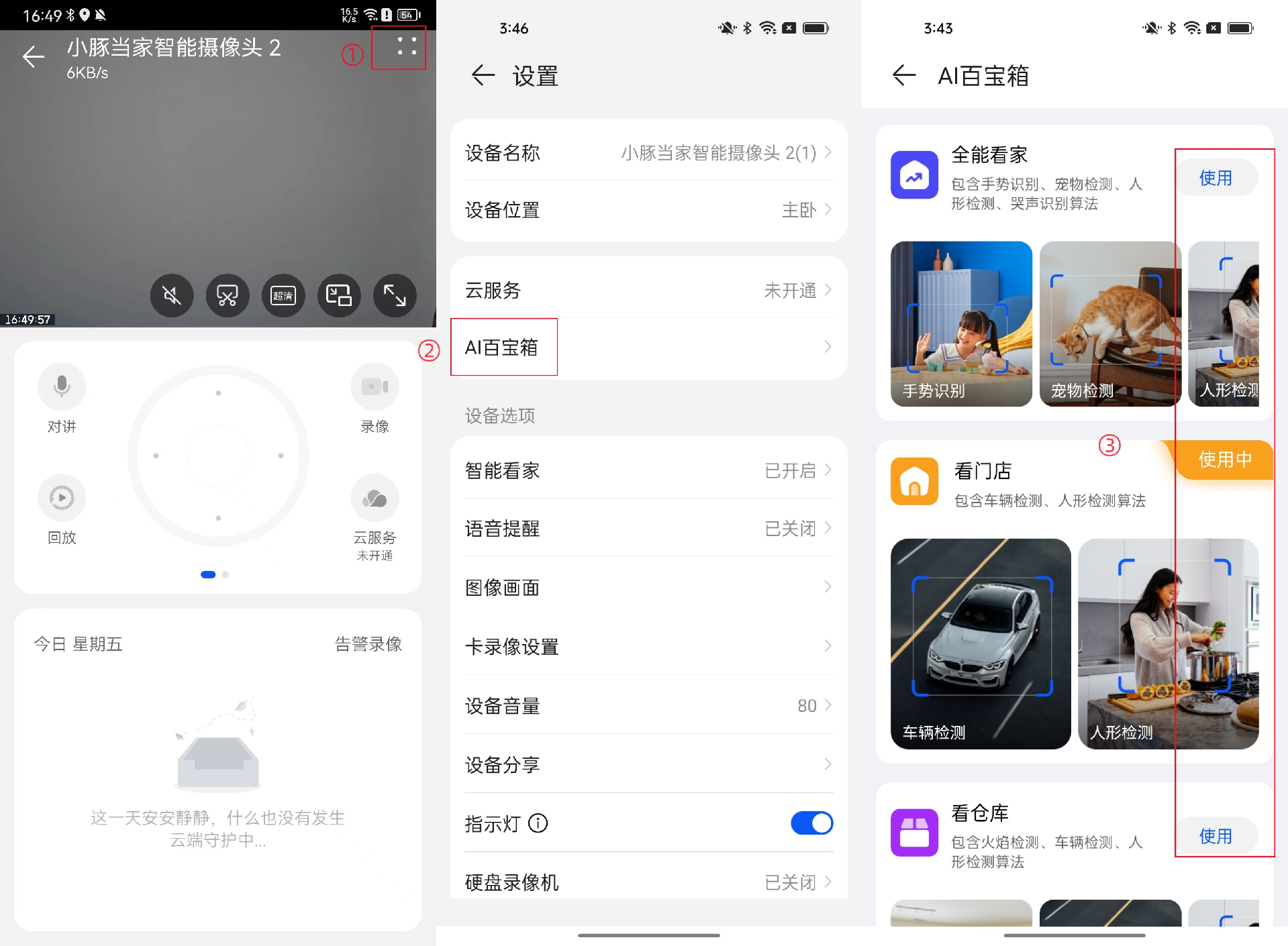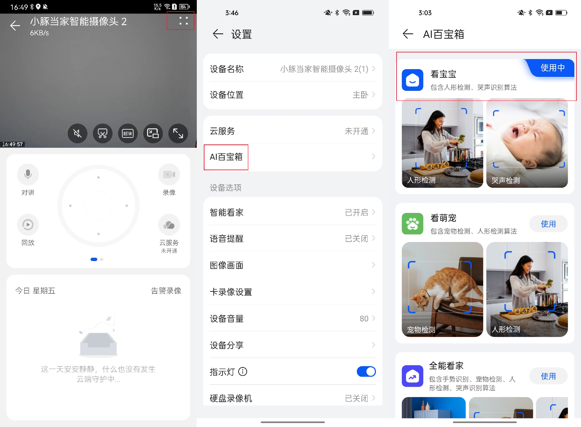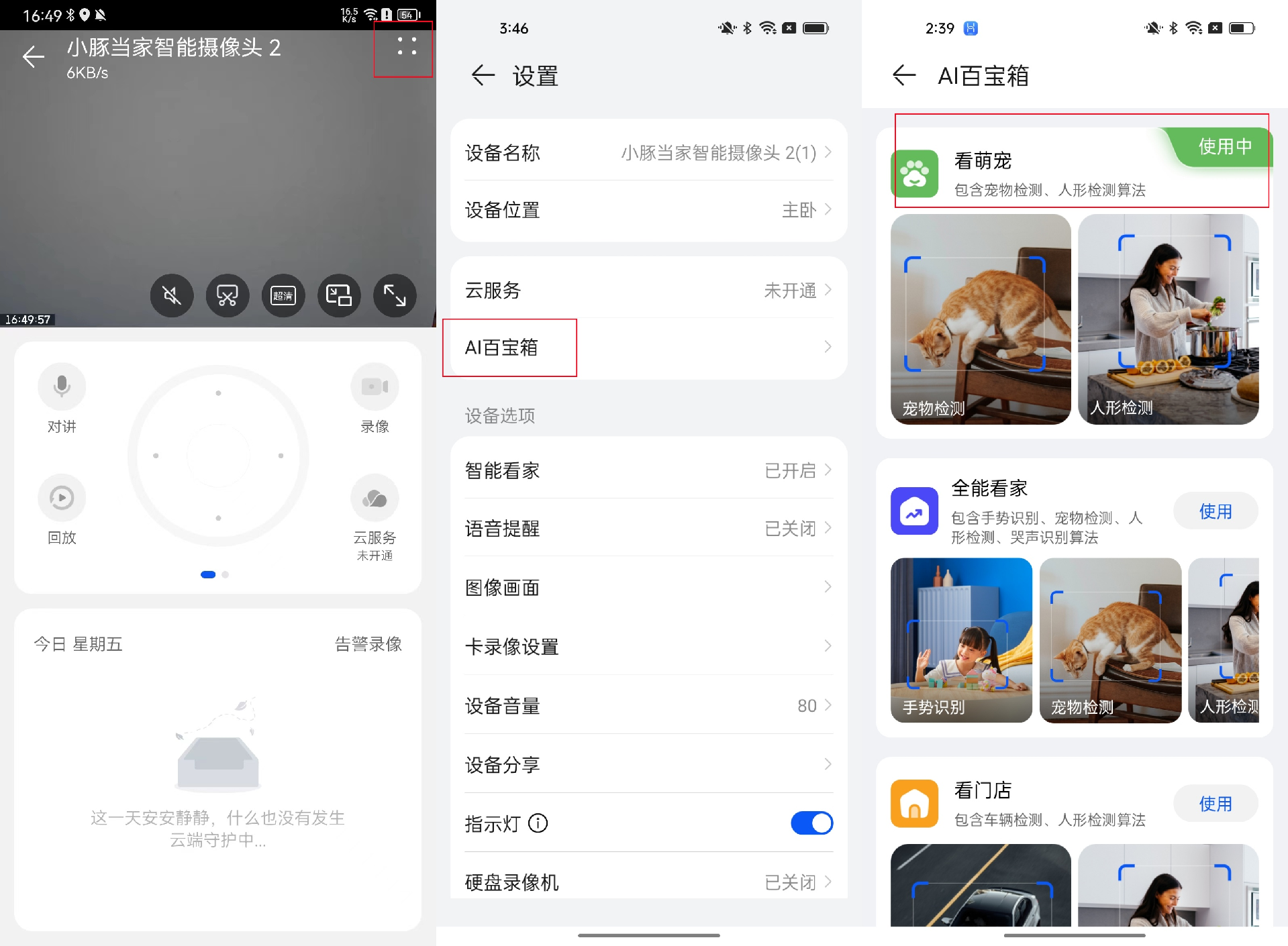 步骤二:进入智慧生活App> 小豚当家智能摄像头2>点击“∷”进入“设置”界面>AI百宝箱,按个人需要开启对应功能按钮画面变化