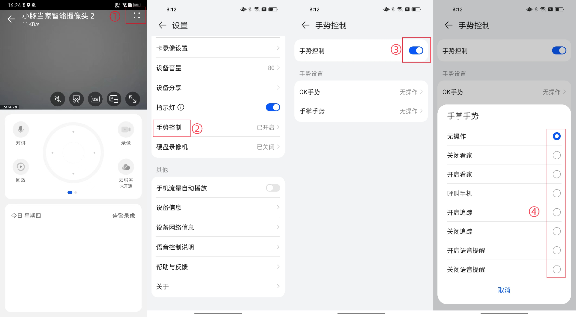 步骤二:进入智慧生活App> 小豚当家智能摄像头2>点击“∷”进入“设置”界面>手势控制>打开手势控制功能>选择“呼叫手机”。